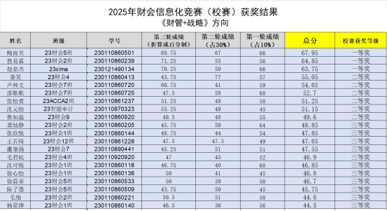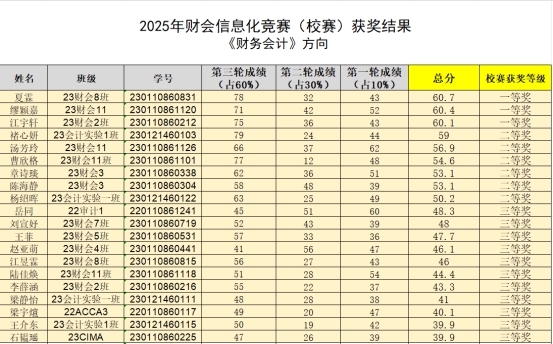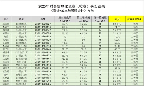 根据竞赛总分排序,“财务会计”、“财务管理+公司战略与风险管理”、“审计+成本与管理会计”每个方向分别决出了一等奖3项、二等奖6项、三等奖11项。这些获奖选手将强强联合组成20支队伍,代表我校参加省赛。
