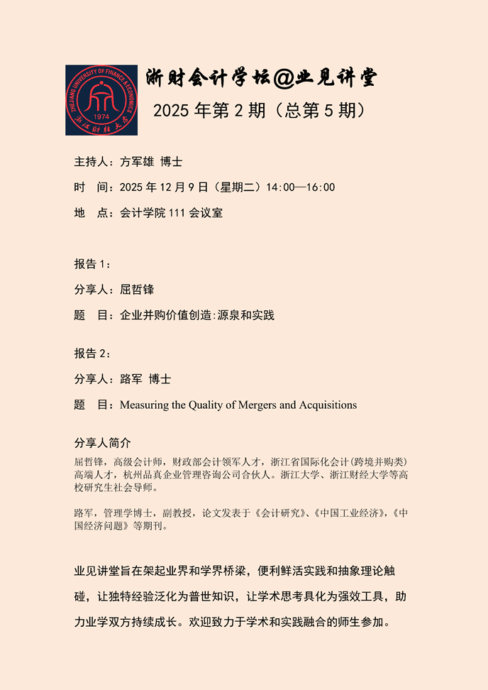 下一条:浙财会计学坛@学术讲座2025年第15期(总第118期)——肖土盛博士