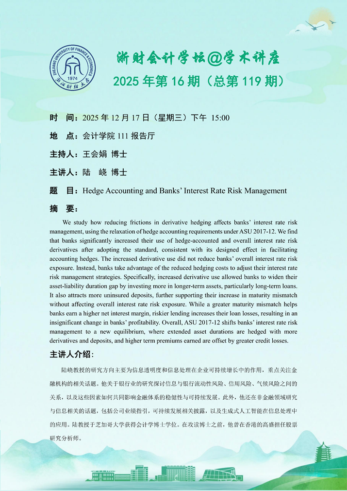上一条:浙财会计学坛@学术讲座2025年第17期(总第120期)——曾晓亮博士