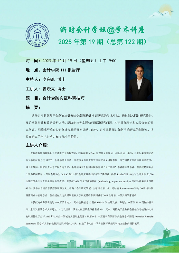 上一条:浙财会计学坛@学术讲座2025年第20期(总第123期)——齐保垒博士