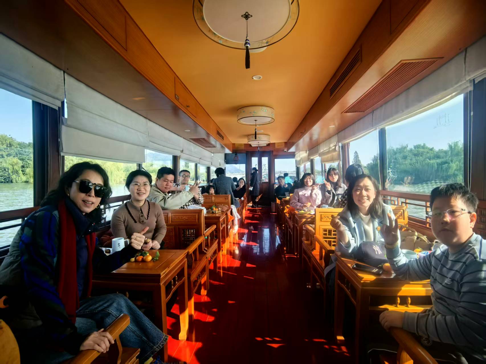 随后,老师们乘上乌篷画舫,泛舟于碧波之上。深秋的湘湖,层林尽染,景色宜人。大家暂别平日繁忙的工作,在湖光山色间畅谈交流,欢声笑语与粼粼波光相映成趣。