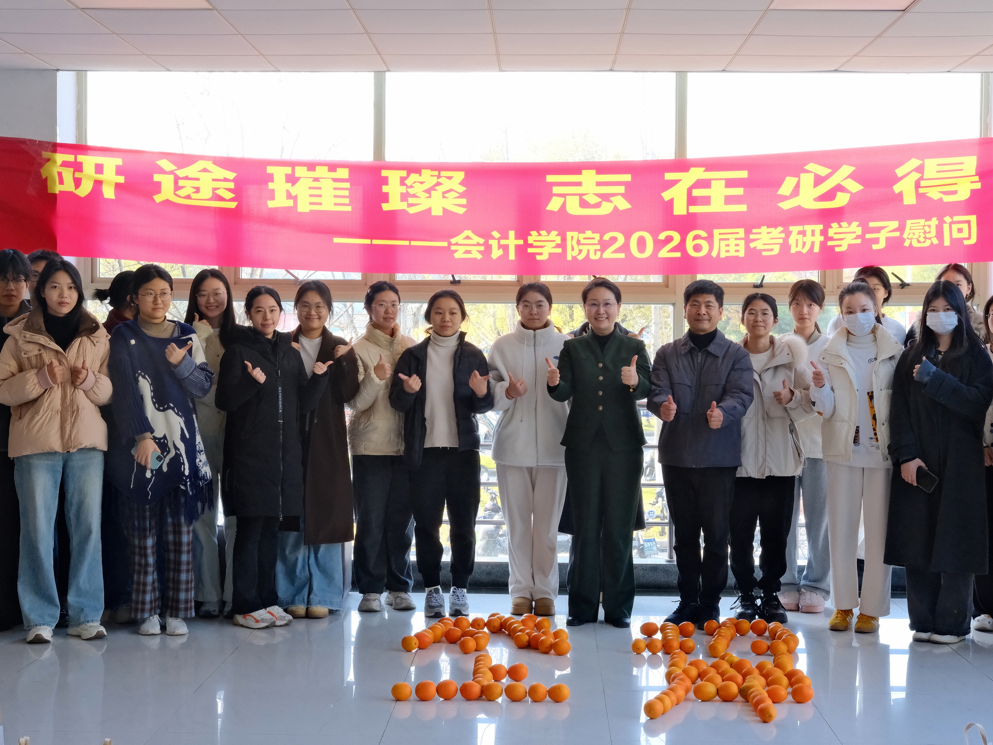 12月9日,会计学院开展“研途璀璨 志在必得”考研慰问活动,学院党委书记张虹、副书记程晓东带领本科毕业班辅导员,为2026届考研学生送上冬日的关怀与真挚的鼓励。