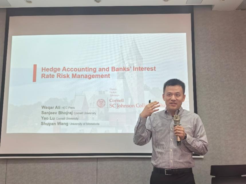 12月17日下午,浙财会计学坛@学术讲座2025年第16期(总第119期)在会计学院111报告厅顺利举行。本次讲座邀请到了陆峣博士。陆峣博士的研究方向主要为信息透明度和信息处理在企业可持续增长中的作用,重点关注金融机构的相关话题。此次讲座主题为“Hedge Accounting and Banks’Interest Rate Risk Management”,本次讲座由学院副院长王会娟教授主持,学院老师季绵绵、邵艳、吴雨晨、俞琳、张安军、张哲以及硕博研究生参加。
