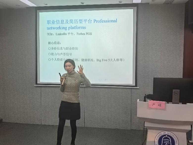 讲座伊始,严硕博士结合自身丰富的科研经验,系统性分享了如何在各个社交平台中进行数据挖掘与捕获,随后,她聚焦于CEO相关的实证研究,通过第三方评价型平台获取内部视角、外部监督与声誉约束等核心信息,并以如何衡量公司内是否有任人唯亲行为这一示例进行具体阐释。讲座过程中严博士逻辑严谨、条理清晰,使在场师生获益良多,引发了热烈的讨论与交流。