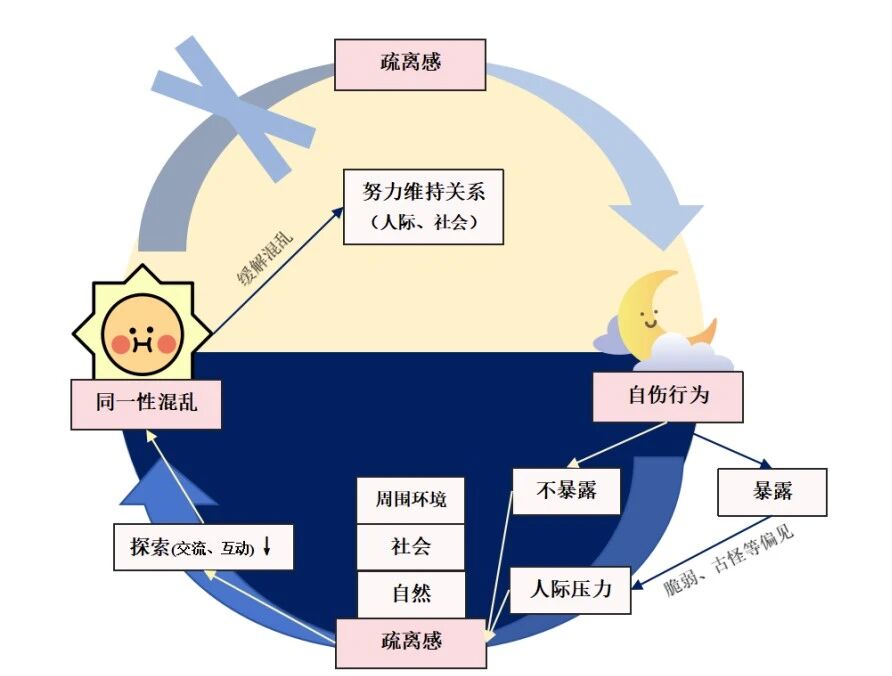 白天会懂夜的黑,黑夜也懂昼的美。同一性混乱和自伤行为相互影响的机制就像白天和黑夜一样关系紧密,循环往复。