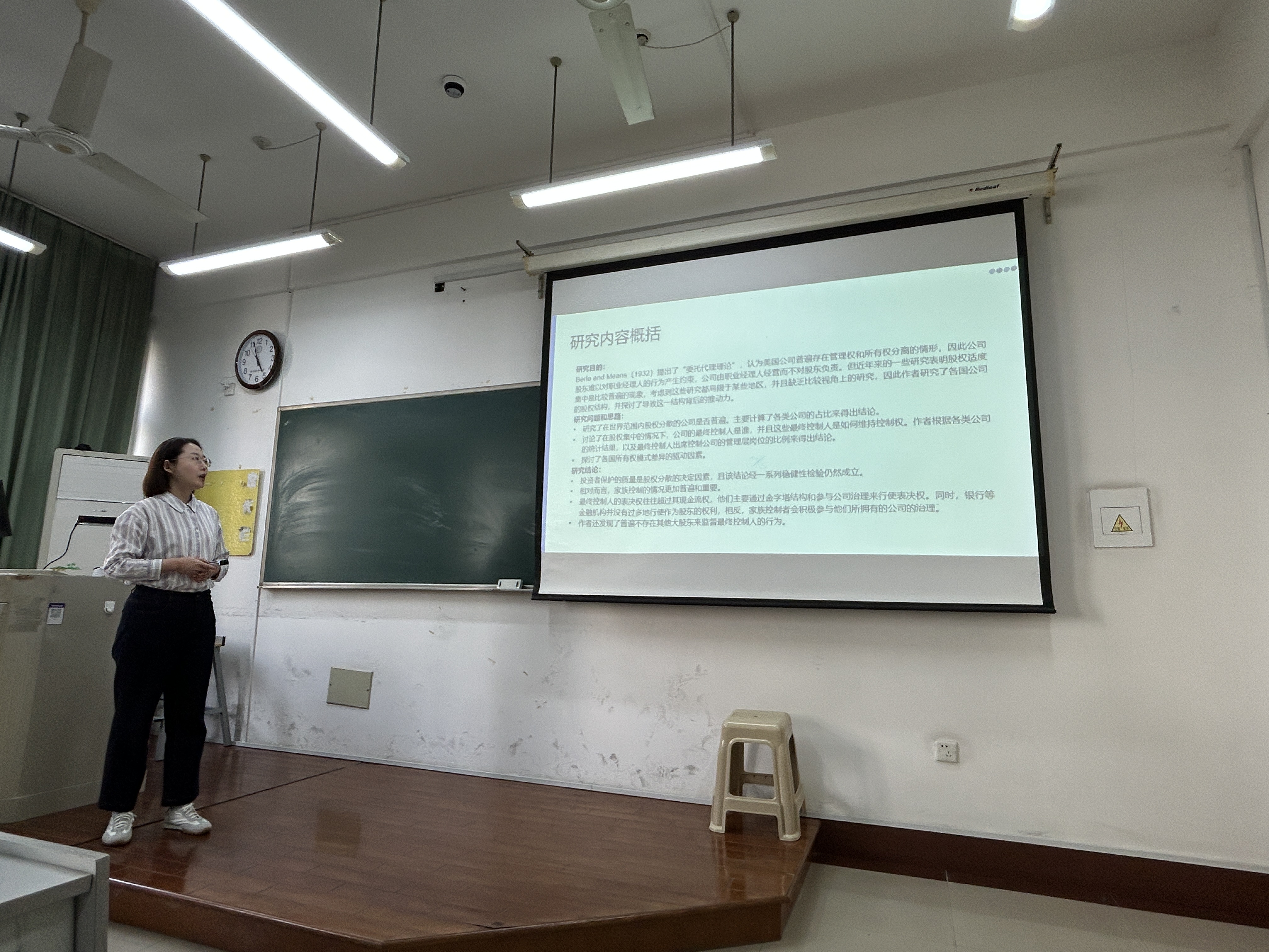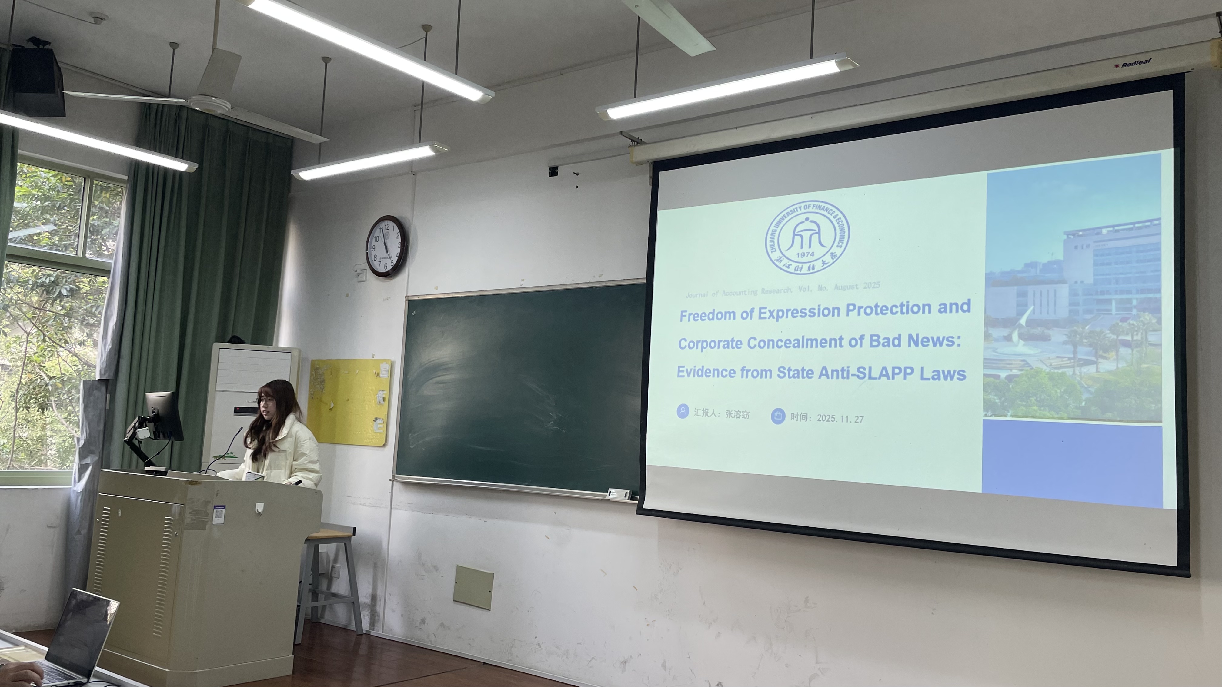 为促进研究生自主开展学术交流活动,提高研究生科研创新能力,锻炼研究锐度,“会计学院学术前沿”第81期于2025年11月27日下午在会计学院206举行。本次学术前沿主讲人单丽莹,张溶窈和乐卓一同学进行了文献研读,会计学院24级和25级全体会计学硕研究生参加本次学术前沿活动。