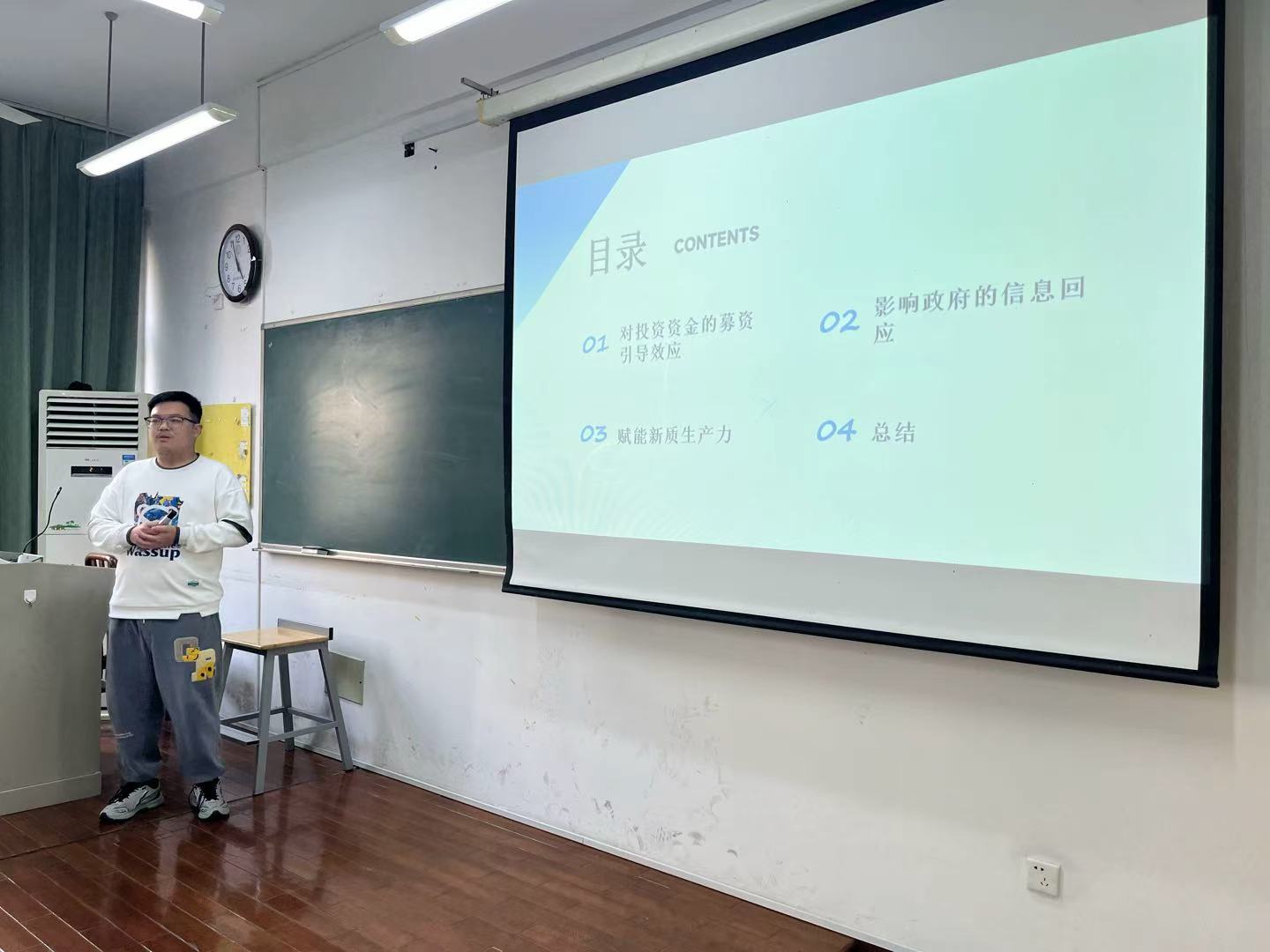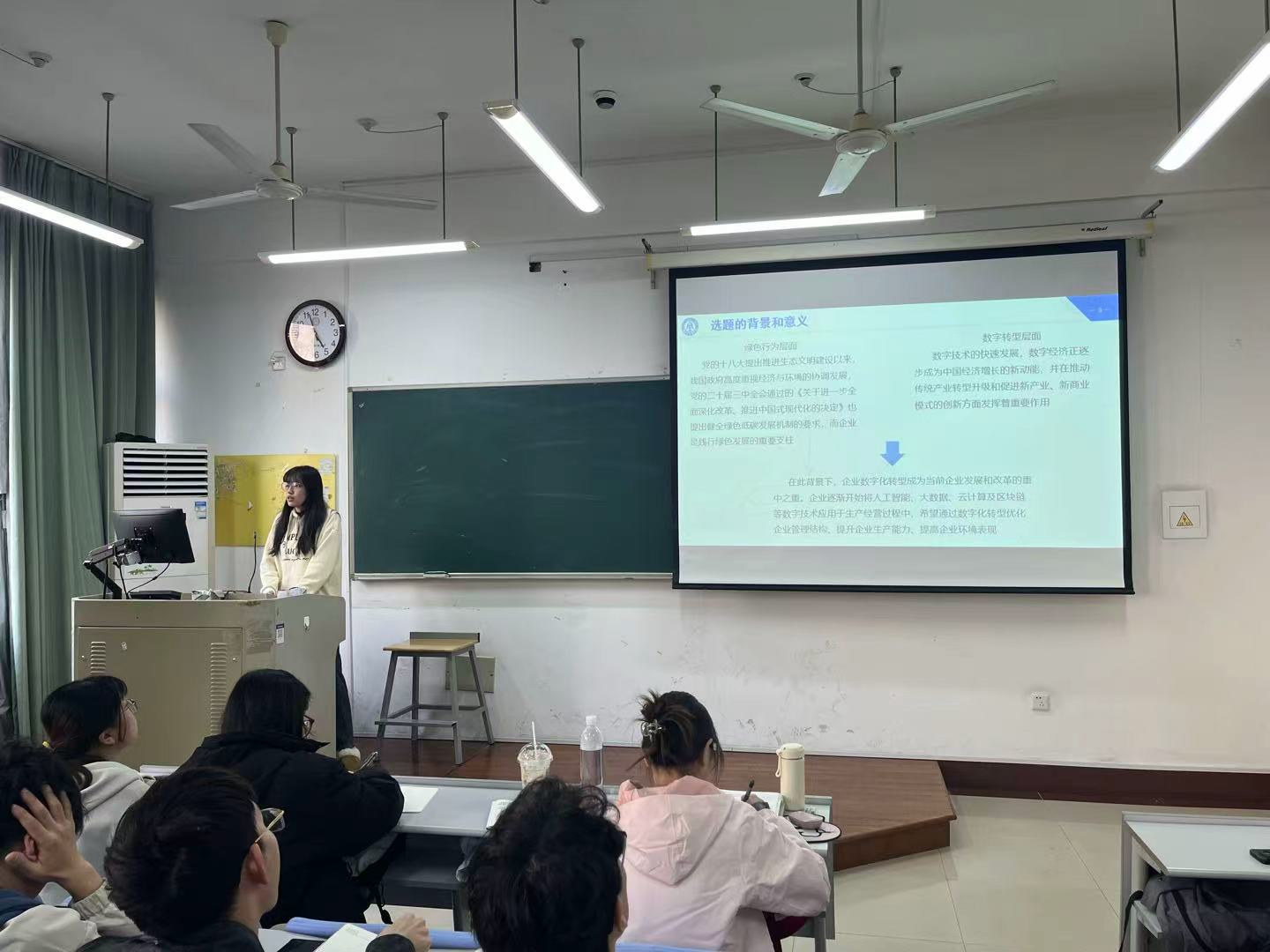 最后,廖文静同学进行论文分享,文章题目为《企业数字化转型、策略性绿色创新与企业环境表现》。文章通过对A股上市公司数据的深入分析,揭示了数字化技术对提升企业环境表现的积极作用,同时指出当前绿色金融政策可能引发的“策略性创新”风险。研究显示,企业数字化转型程度每提高1个单位,其环境表现得分显著提升0.363分。人工智能、云计算、大数据等具体技术均展现出明显的环境赋能效应。廖文静同学在汇报中指出:“数字化不仅是效率工具,更是企业实现绿色转型的重要路径。”然而,研究也发现,绿色债券等政策虽意图鼓励创新,却在实践中可能扭曲企业行为。2021年《绿色金融评价方案》实施后,部分企业为获取补贴倾向于开展“策略性绿色创新”,而减少真正具有环保价值的“实质性创新”。该文章进一步提出政策建议:在推动数字化和绿色金融的同时,应建立以创新质量为导向的评估体系,加强资金使用监管,防止激励政策被异化为“创新套利”工具。此次汇报为理解数字经济时代的环保机制提供了新视角。