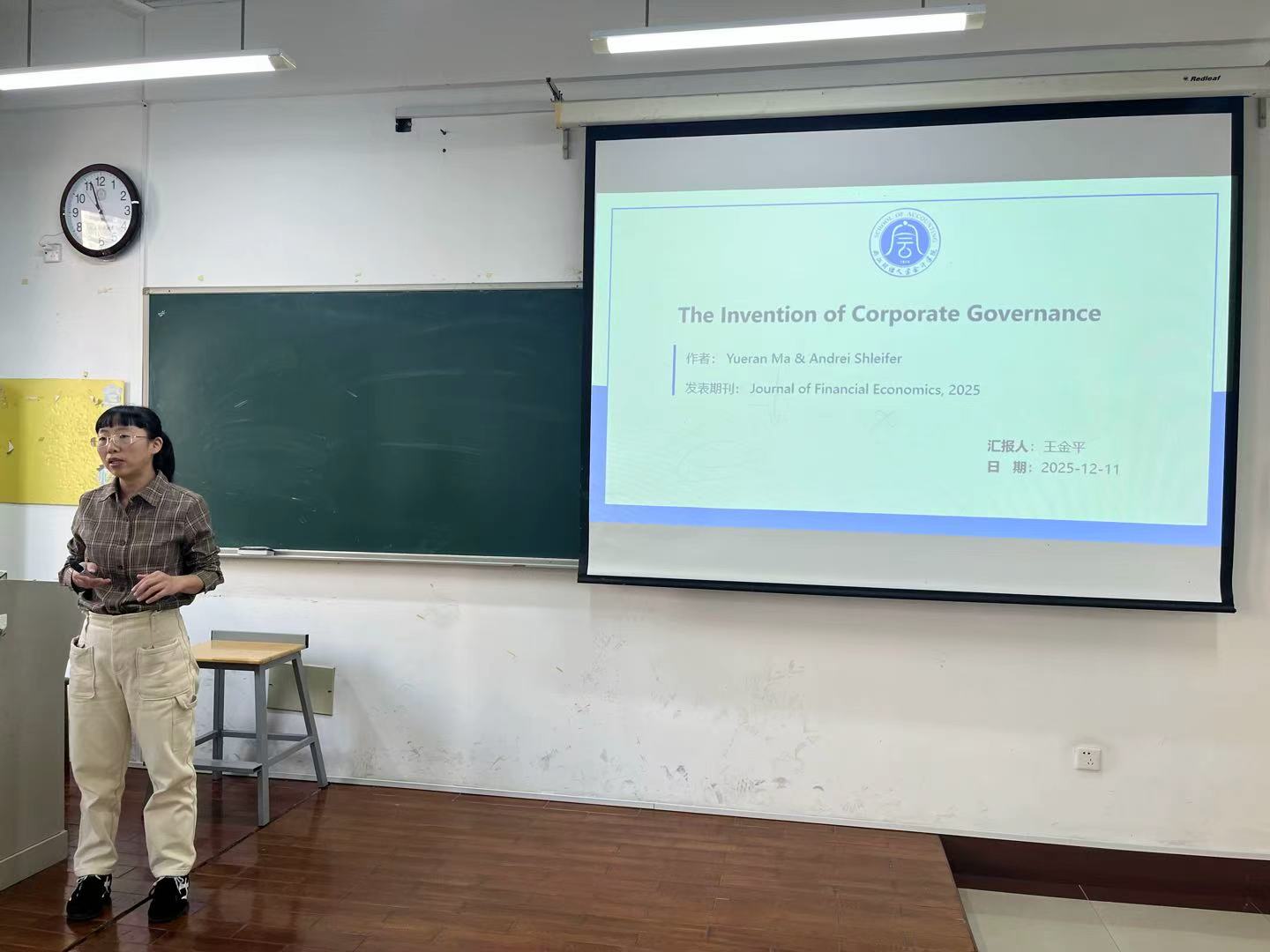 其次,王金平同学向我们分享了论文《The Invention of Corporate Governance》。王金平首先介绍了本文的研究背景、研究问题。在《The Invention of Corporate Governance》的演讲中,王金平系统回顾了公司治理思想的百年演进。研究指出,现代公司治理的核心问题——“两权分离”所引发的管理层与股东利益冲突,早在亚当·斯密的著作中便有洞见。随着Berle和Means在1932年将法律推至核心地位,再到Jensen等人引入市场激励与债务约束,公司治理的“工具箱”不断丰富。该研究发现,治理机制并非单一药方,而是法律(公共治理)与市场(私人治理)的复杂结合。法律体系奠定了防止利益掏空的底线,而薪酬激励、杠杆收购等市场机制则试图驱动管理层与股东利益对齐。研究尤其指出,后续对股权激励效果的反思,揭示了任何单一机制都存在局限性。历史的启示在于,有效的公司治理需要一套互补且动态调整的制度组合,以应对不断演变的管理层代理问题,从追求规模扩张到如今的ESG目标。