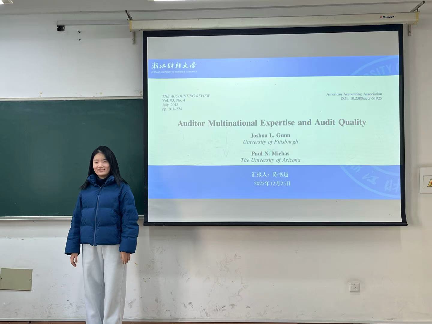 首先,陈书越向同学们分享的文献是《Auditor Multinational Expertise and Audit Quality 》。研究揭示,审计师事务所分所层面的跨国专业知识对提升跨国集团审计质量具有显著作用。该论文由Joshua L. Gunn和Paul N. Michas合作完成,通过对2003年至2015年间美国上市公司的数据分析,为复杂跨境审计的监管与实务提供了重要参考。研究指出,随着企业全球化运营日益普遍,跨国审计的复杂性陡增。然而,审计质量的关键差异并非仅存在于事务所之间,更体现在事务所内部各分所的专业能力上。研究发现,具备“本地跨国审计市场领导者”地位或拥有“特定国家审计专家”经验的分所,其审计的客户发生财务重述的概率显著降低。进一步分析表明,这种专业知识的积极作用在三种情境下尤为突出:客户海外销售比例高、子公司位于法治薄弱国家,或子公司所在国未强制采用国际财务报告准则(IFRS)。这表明跨国专长在审计环境最复杂、风险最高的领域中发挥出关键性的风险缓解作用。此项研究不仅拓展了审计师专业能力的理论维度,也为监管机构优化监督重点、会计师事务所加强分所专长建设提供了实证依据。文章认为,未来审计行业应更注重分所层面跨国协调能力的系统性培养,以应对全球化带来的审计挑战。