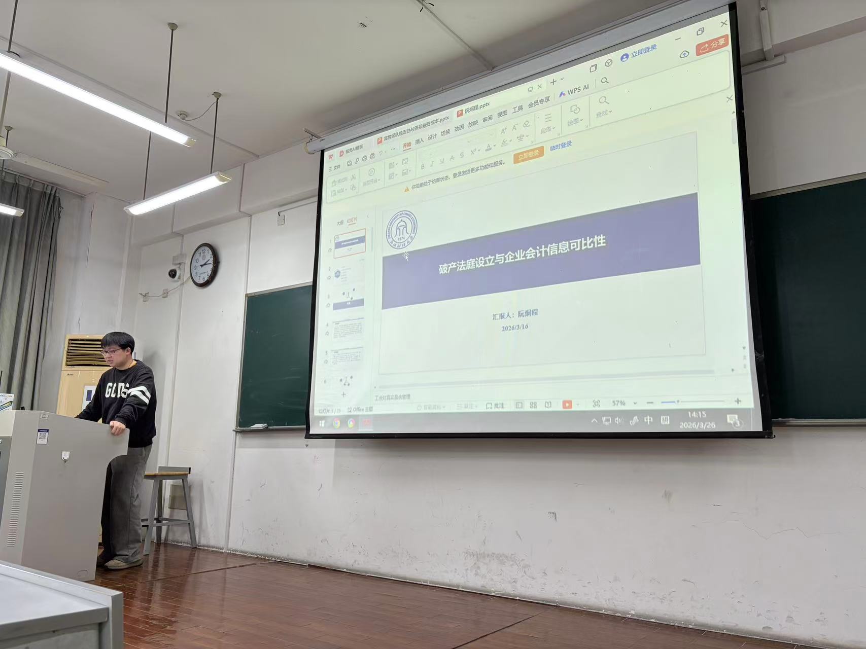 阮炯程同学带来的《破产法庭设立与企业会计信息可比性》研究,立足中国“放管服”改革与破产司法体系完善的背景,以2015-2023年沪深A股上市公司为研究对象,深入分析了破产法庭设立对企业会计信息可比性的作用机制与影响结果。研究通过市场竞争、债务融资成本、投资者关注三大渠道验证了核心假设,发现破产法庭的设立会显著降低企业会计信息可比性,而这一影响在管理层持股低、内部控制质量弱、财务风险高的企业中更为突出。此外,研究还证实企业会计信息可比性的降低会进一步增加经营风险。该研究为政府完善破产法庭监管机制、企业规范信息披露行为提供了重要的理论依据与政策建议。