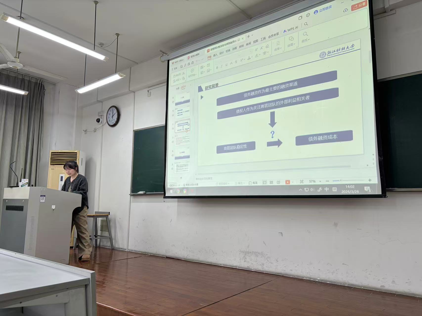 2026年3月26日,浙江财经大学会计学院学术前沿论坛2026年第3期(总第88期)顺利举办。本次论坛聚焦会计与公司金融领域前沿研究方向,李楠、阮炯程、吴泽晗三位同学分别围绕高管团队稳定性、破产法庭设立、高管团队协同性与企业债务融资成本、会计信息可比性的关联展开深度分享,为学界和业界理解企业经营发展的关键影响因素提供了全新的研究视角与实证参考。