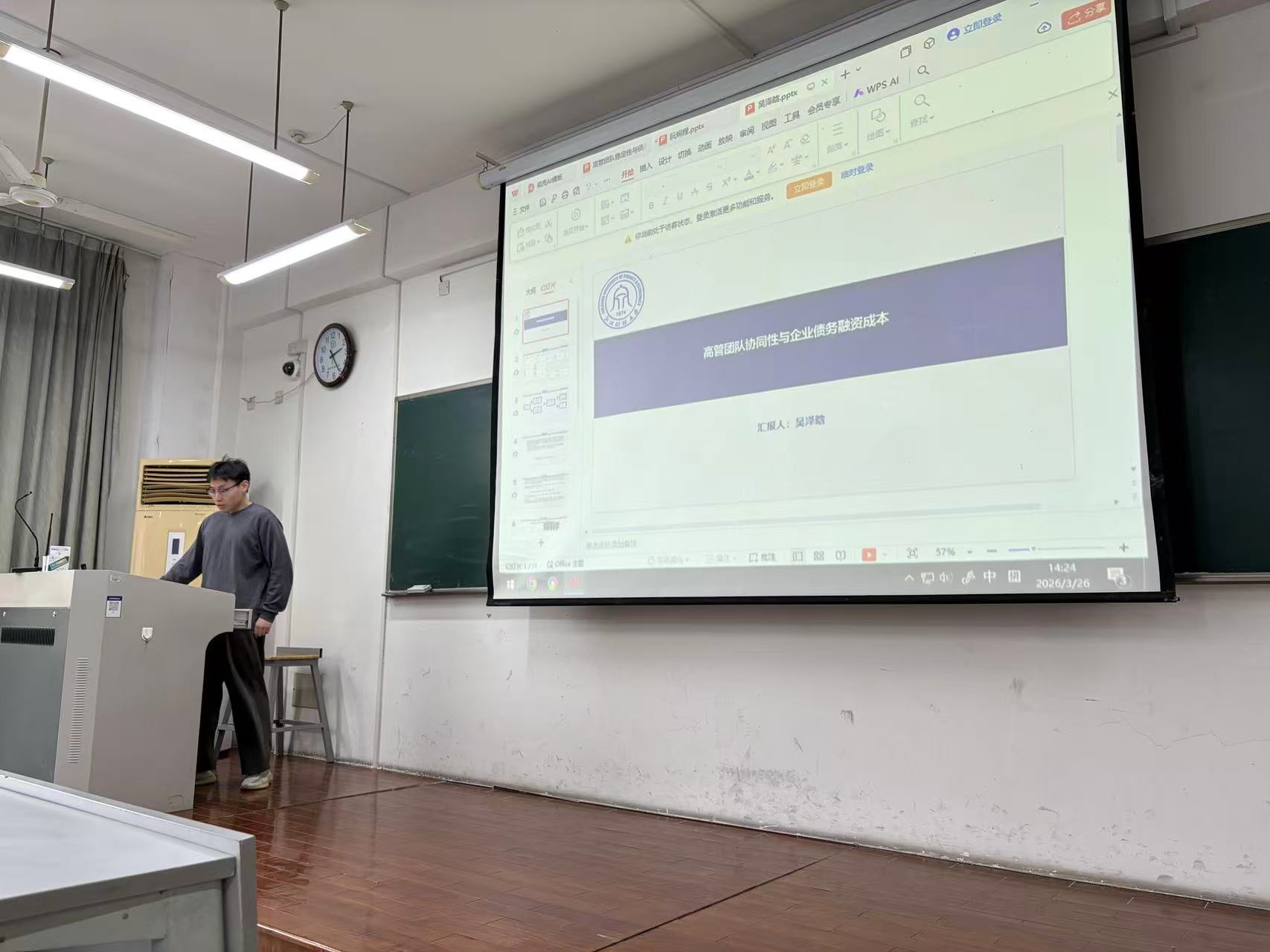吴泽晗同学在《高管团队协同性与企业债务融资成本》的汇报中,基于高层梯队理论与薪酬契约理论,将高管薪酬激励敏感系数离散度作为团队协同性的衡量指标,探究了其与企业债务融资成本的内在关联。研究采用两种债务融资成本度量方式,以大样本实证检验证实高管薪酬激励强度的离散度与债务融资成本呈正相关,即高管团队协同性越低,企业债务融资成本越高。同时,研究揭示了经营风险、内部控制风险、商业信用融资、战略差异度、多元化经营是二者之间的关键作用机制,打破了传统研究聚焦高管个人特征的局限,从团队视角丰富了高管薪酬与债务融资成本的相关研究,为企业设计高管薪酬契约、提升团队协同性提供了新的思路。